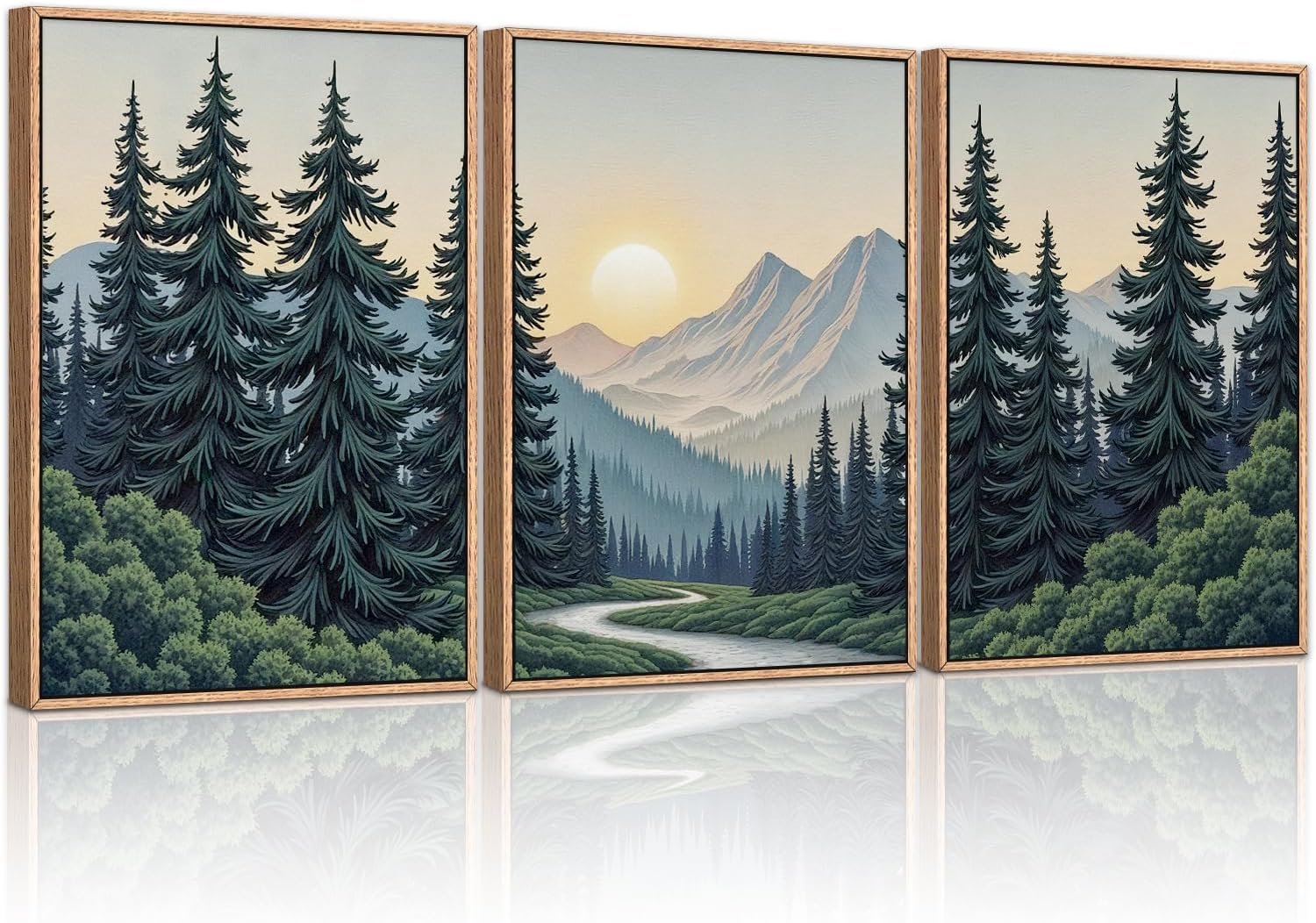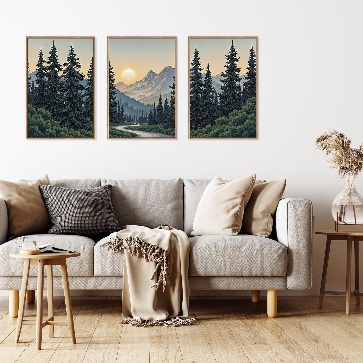 HLNIUC Mountain Forest Sun Framed Wall Art,Large Boho Pine Tree Canvas Wall Decor Set of 3(16”x24”)Ridge Mountain Landscape Picture Prints,Natural Sunset Woodland Wall Painting for Living Room,Bedroom