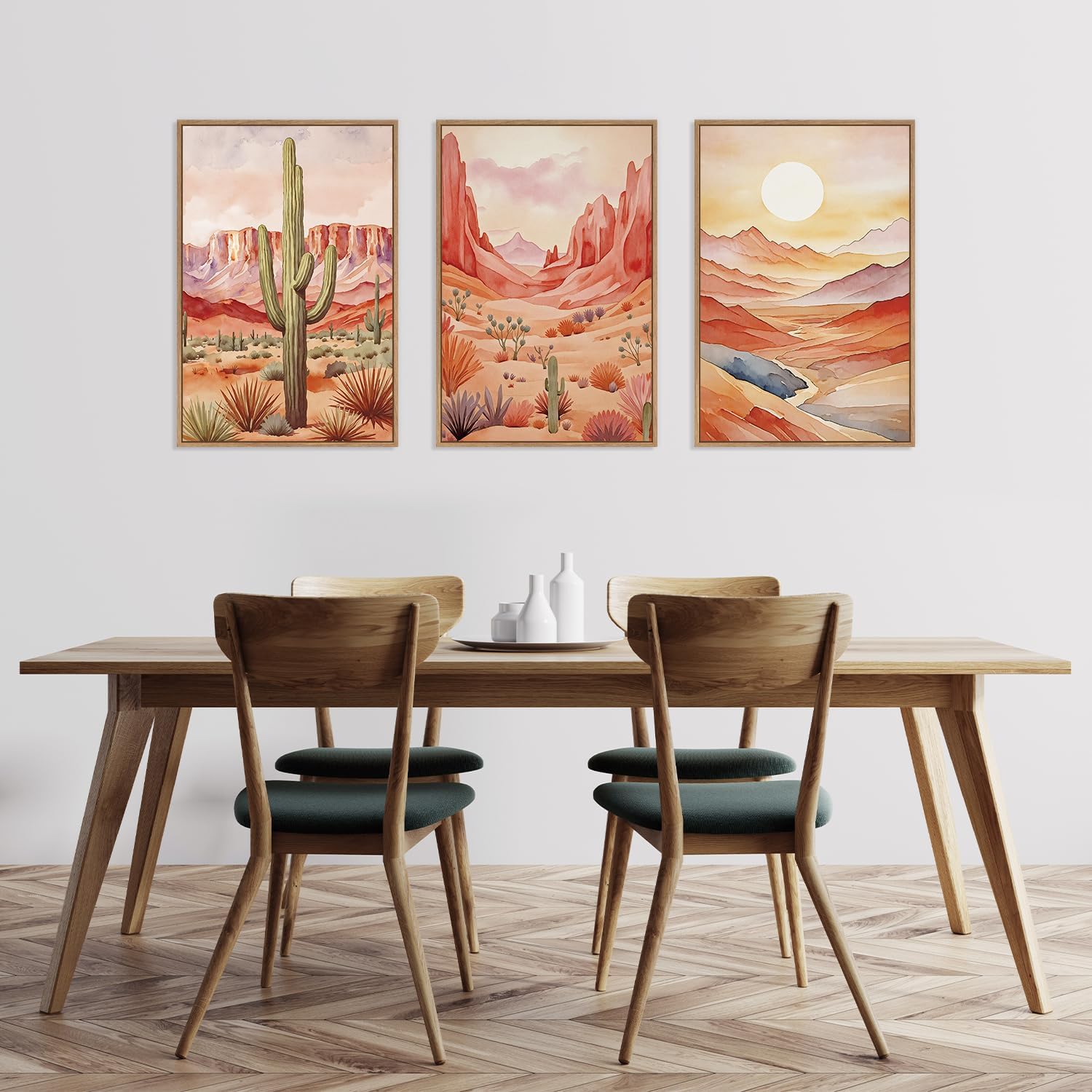 HLNIUC Boho Desert Plant Framed Canvas Wall Art Set,Southwestern Sun Mountain Wall Decor,Cactus Sunset Landscape Wall Painting,Watercolor Abstract Desert Art Prints for Living Room,Bedroom - 16”x24”x3