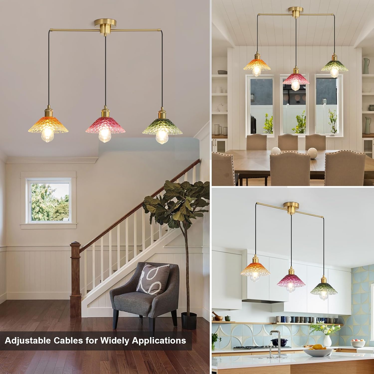 - Colorful Vintage Glass Shade: This glass vintage chandelier features gradient glass shades in green, red, and amber, with a unique honeycomb texture that creates vibrant, artistic light reflections. And it crafted with a brushed brass finish on the canopy and socket, combining vintage charm with modern elegance and excellent durability.