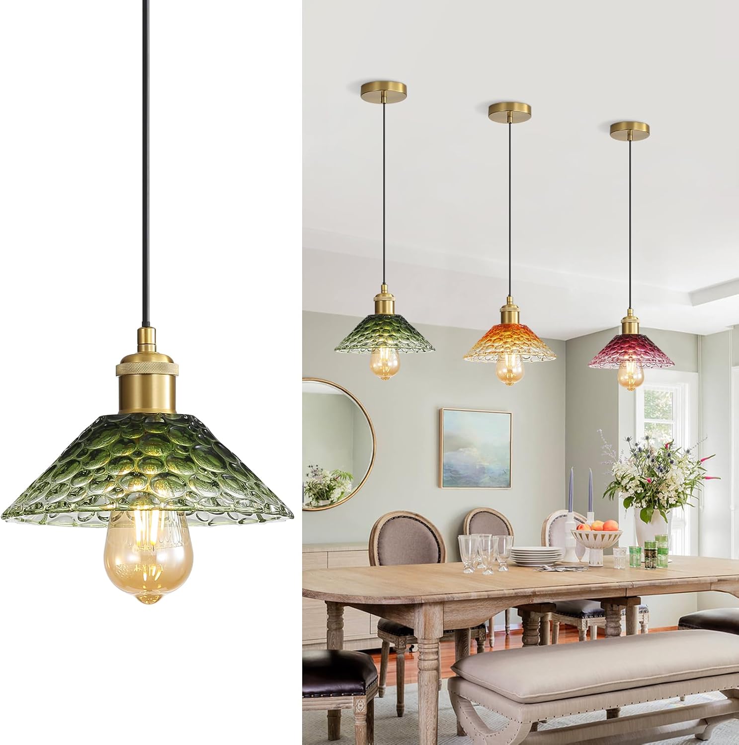 - Colorful Textured Glass Shade: This glass vintage chandelier features gradient glass shades in green, red, and amber, with a unique honeycomb texture that creates vibrant, artistic light reflections. And it crafted with a brushed brass finish on the canopy and socket, combining vintage charm with modern elegance and excellent durability.