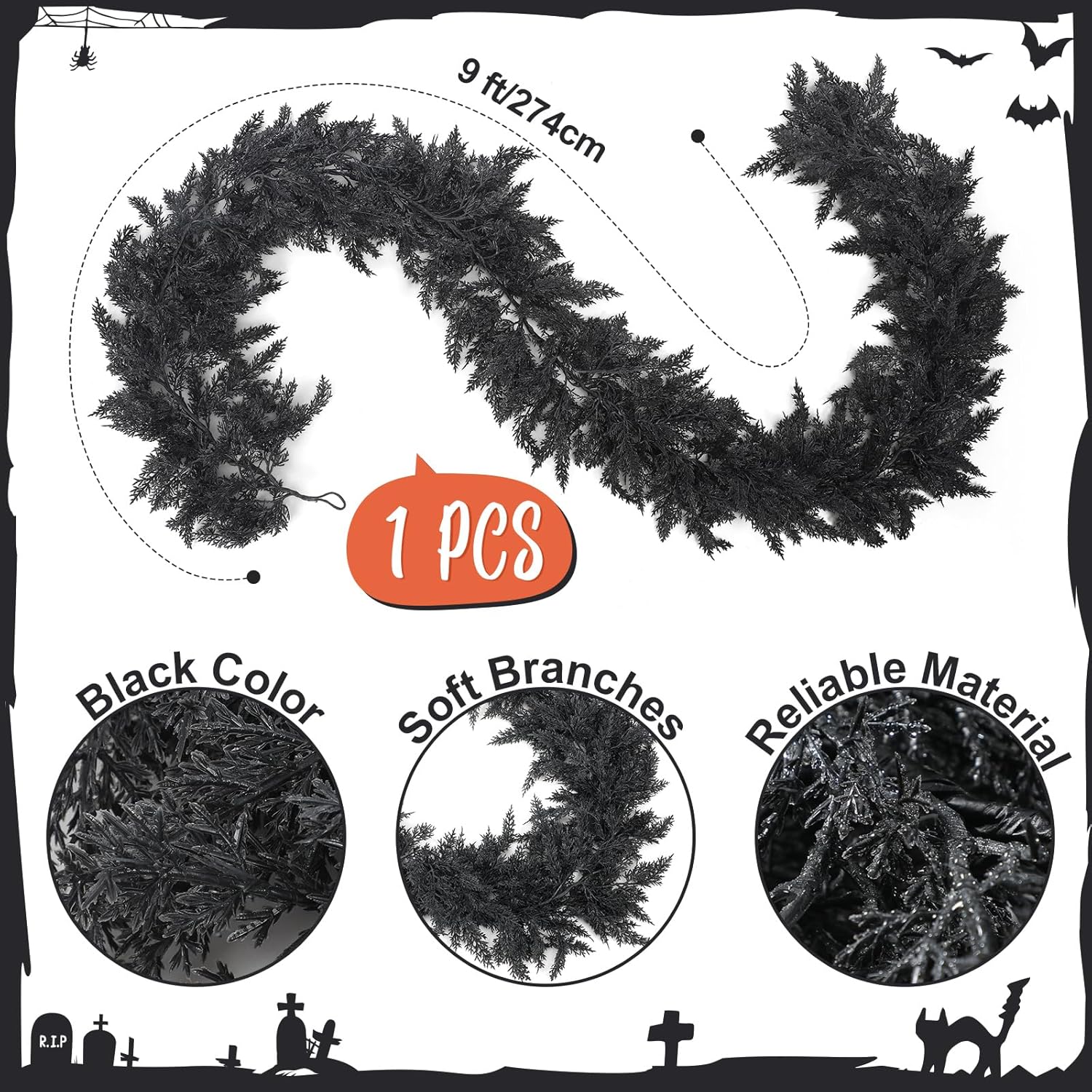 - Seasonal Ambience: Designed in a deep black hue with a realistic cedar texture, this 9ft Halloween garland adds a bold and eerie touch to your Halloween displays, creating a haunting atmosphere for doorways, mantels, banisters, or party backdrops
