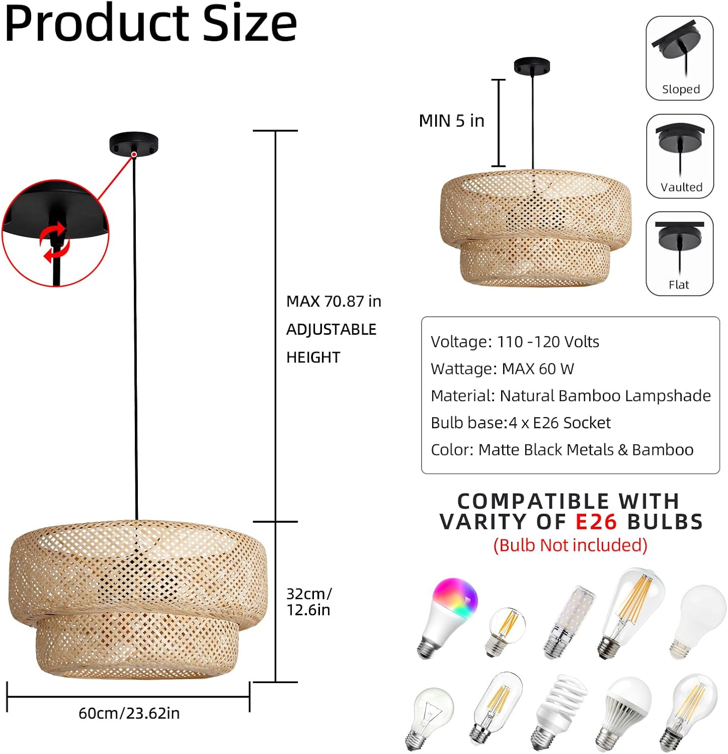 23.62" Bamboo Pendant Light,4-Light Boho Rattan Hanging Light,Hand Woven Wicker Chandelier for Kitchen Island for Kitchen Island Dining Bedroom Living Room Restaurants