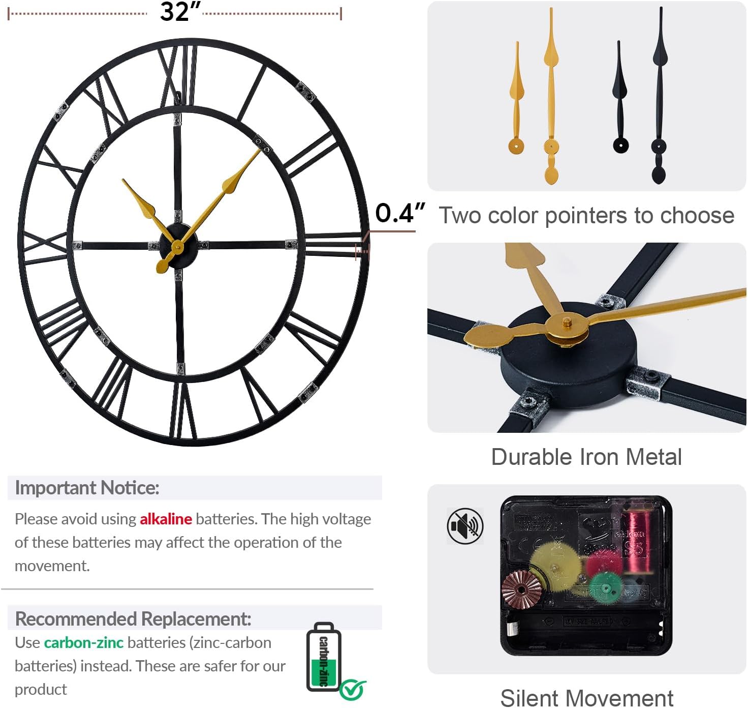 - Important: Avoid using alkaline, lithium battery or high-power batteries, as they may affect the clock movement. Use carbon-zinc (zinc-carbon) batteries instead for best performance. Note: Batteries are not included.