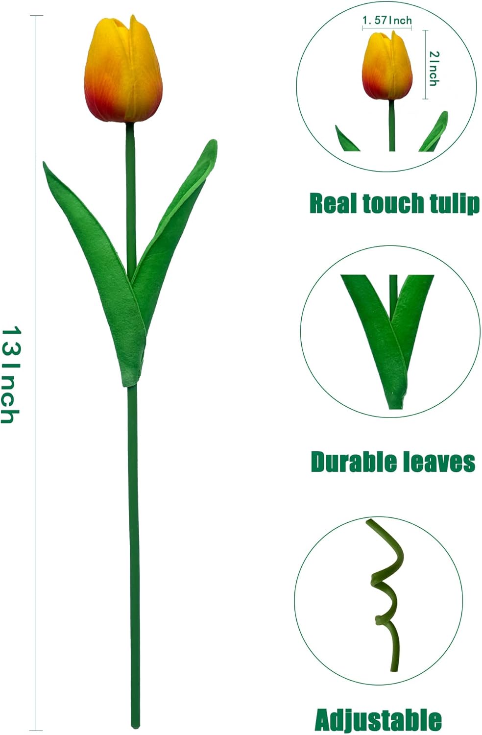 - MATERIAL: Our artificial tulips are made of plastic and polyurethane, which has a soft texture and a realistic touch. Inside the stem is durable wire that can be easily bent and cut to fit different vases as needed