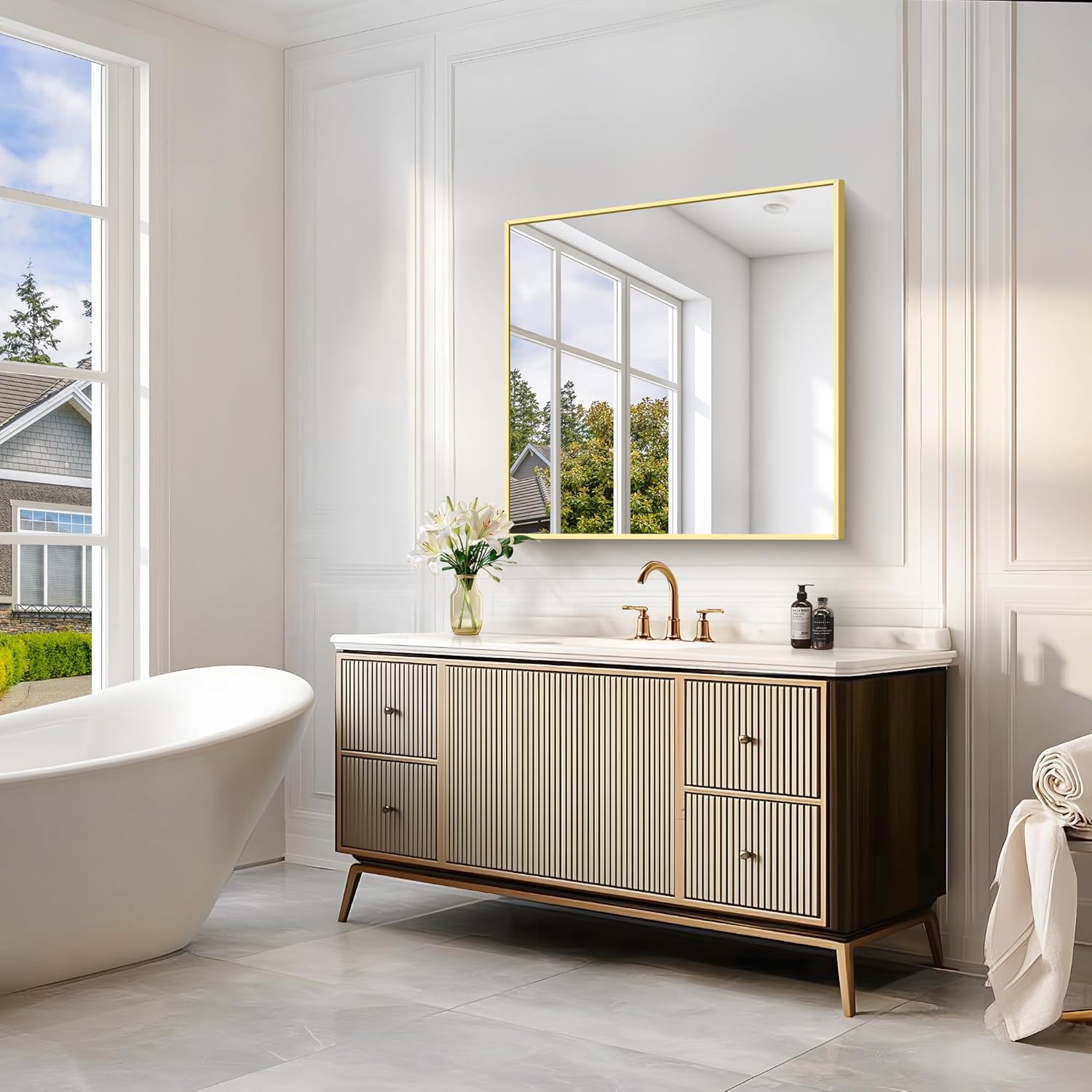 Gold Bathroom Mirror for Wall, 30x30 Inch Rectangle Mirrors with Metal Frame, Modern Vanity Wall Mirror Decor for Bathroom Living Room, Entryway Hangs Horizontal or Vertical