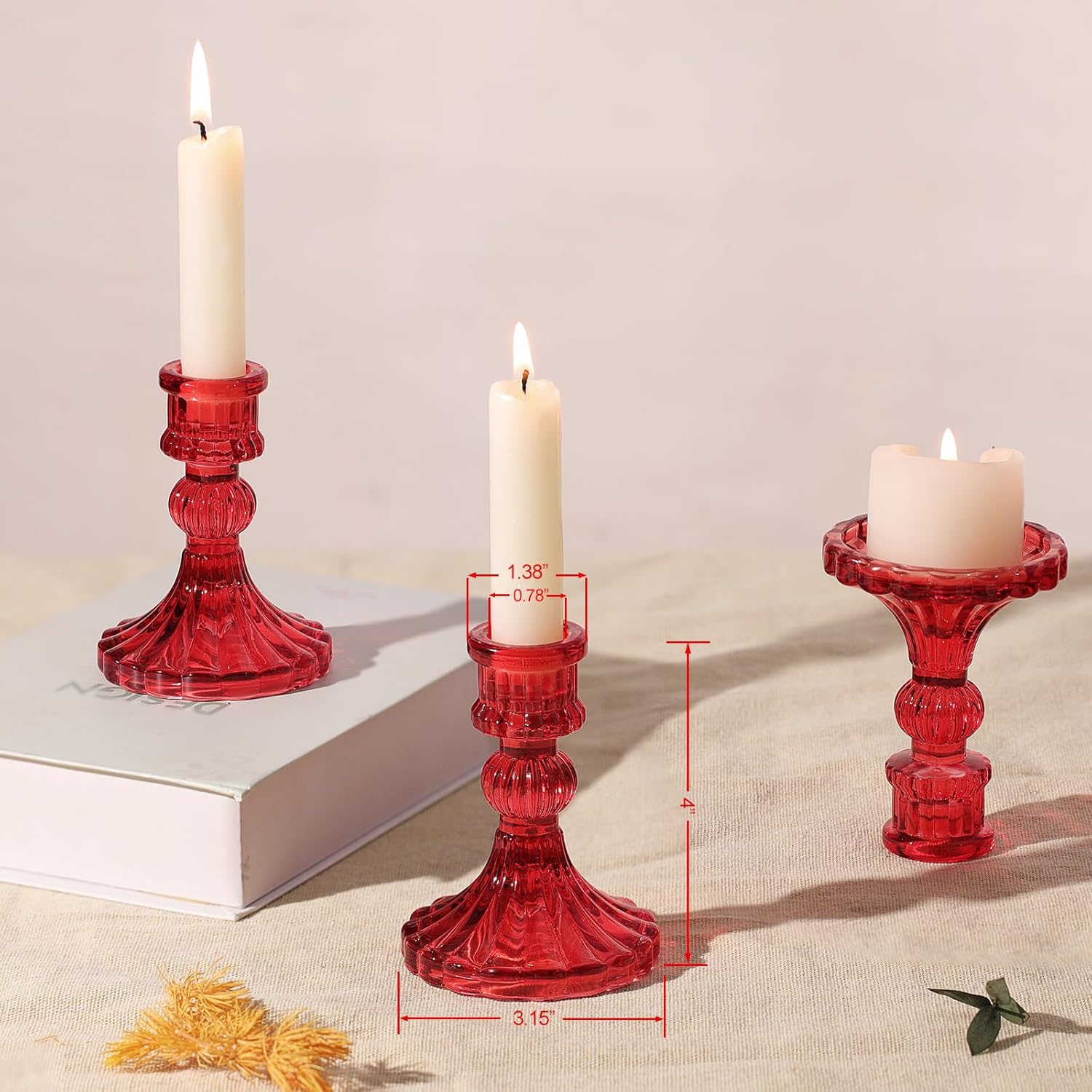 - Red Candlestick Holders-- You will get 12pcs red candlestick holders set, here is enough quantity for your daily use and never worry about what if one is broken. The top inner diameter 0.78'', bottom diameter is 2.95''x 4''H. Conveniently sized candle holder are suitable for many kinds of taper candles.