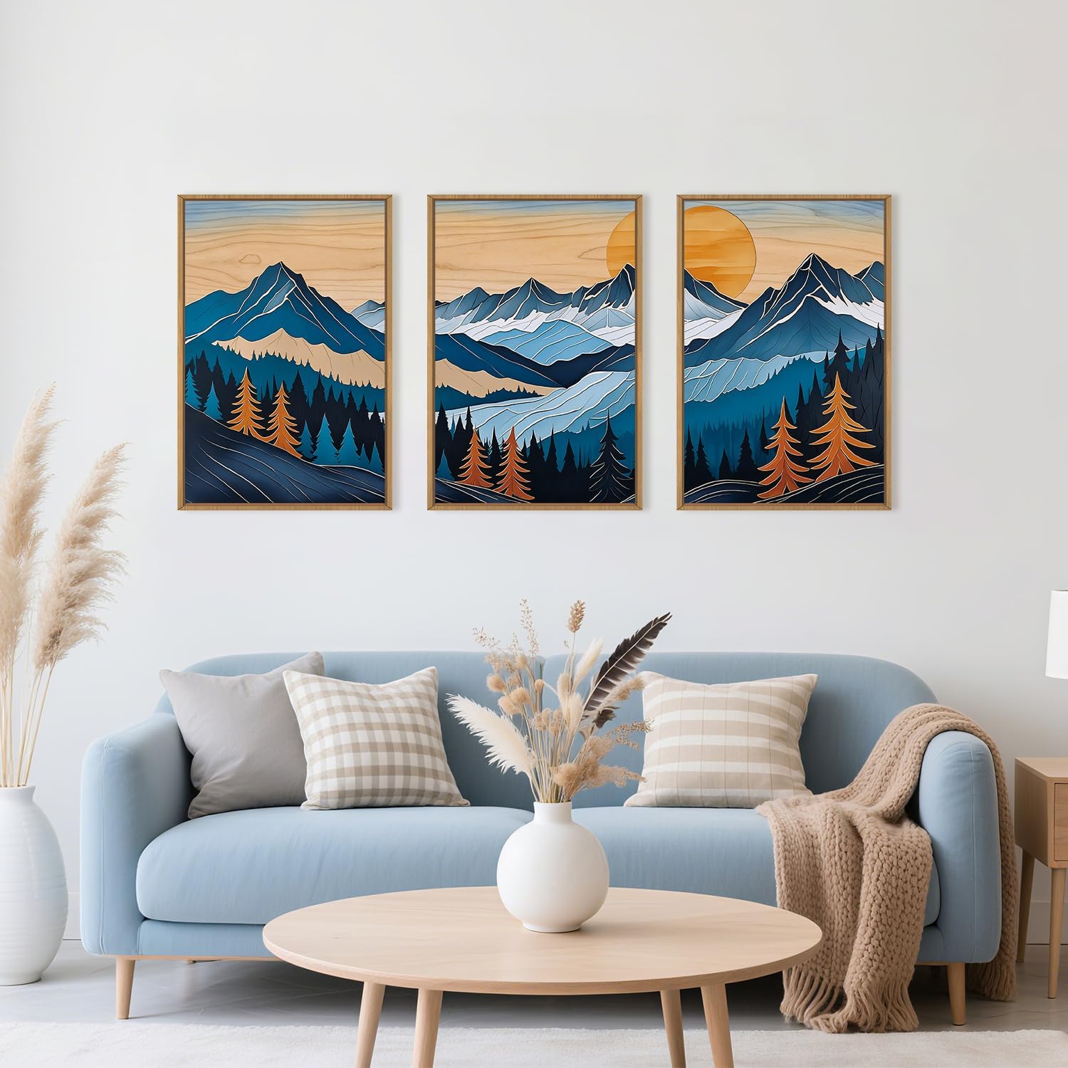 Blue Woodcut Mountain Framed Canvas Wall Art Set, Boho Abstract Ridge Wall Decor, Pine Tree Landscape Wall Painting, Sunrise Forest Art Print for Living Room, Bedroom, Office - 16"X24"X3