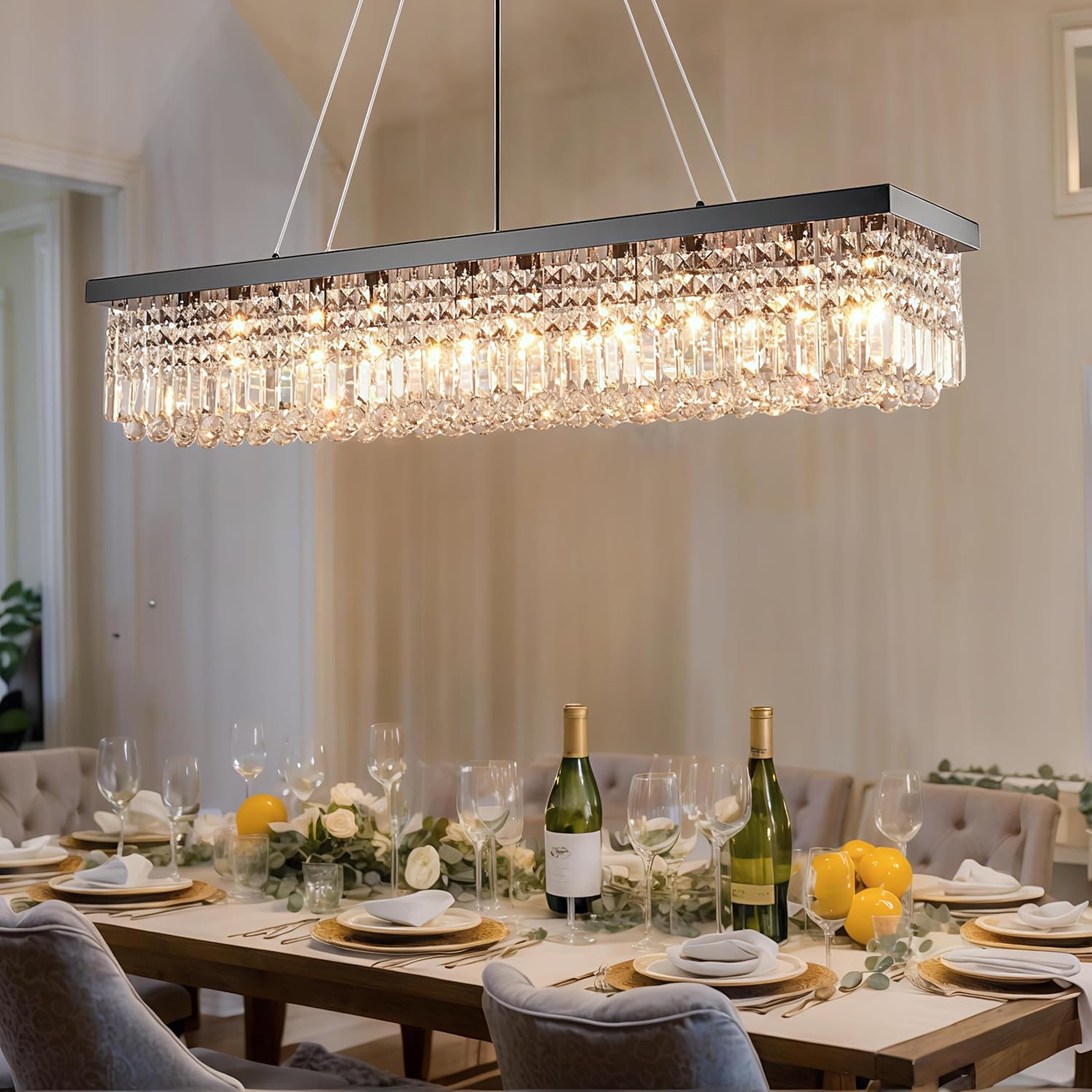 Rectangular Black Crystal Chandelier,10 Light Crystal Chandeliers for Dining Room, Rectangle Light Fixture for Kitchen Island L47''xW10''x H10''