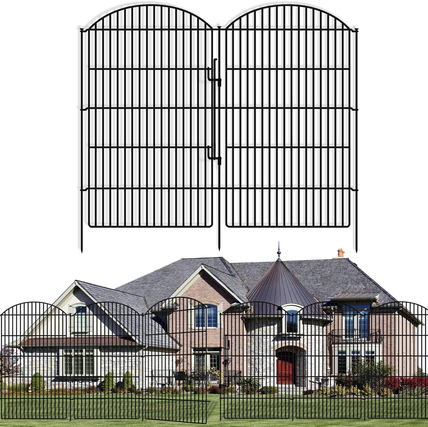 - MORE AVAILABLE SIZE: The classic arch shape design garden fence single piece measures 29" wide, 48" high, 1.4" gap. Comes with 11 metal stakes are 53.66" in height, which can be inserted into about 10.63 inches above the ground, making it strong enough to prevent animals from entering & leaving, dog digging, and even keep rabbits away from your plants. A total of 10 fence panels with a lock, connecting 11 fence stakes, the total length of the garden fence is approximately 24 ft.