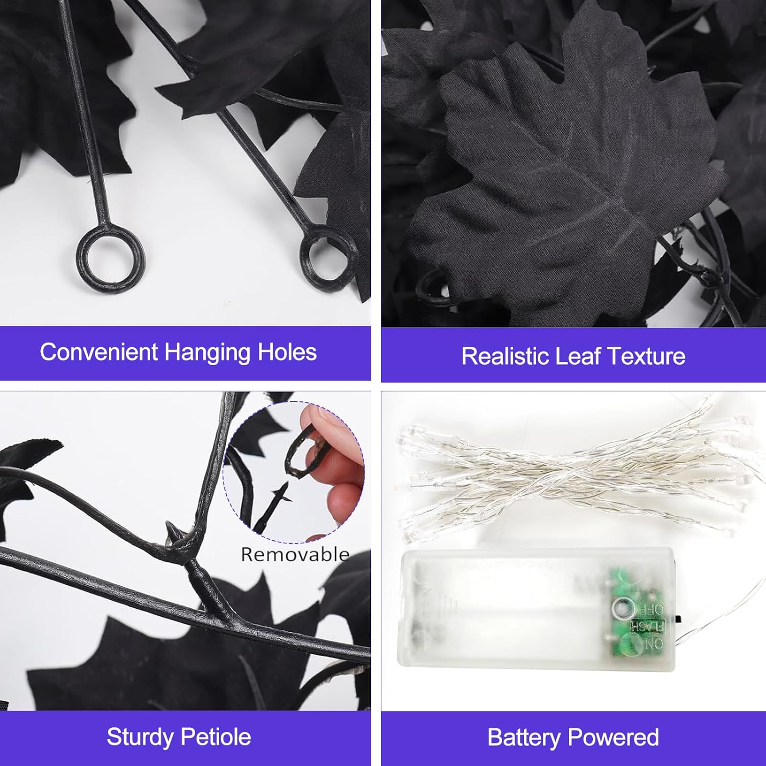 - Battery Operated: Our Halloween leaves garland with lights powered by 2AA batteries, this black Halloween garland offers unrestricted placement options.The integrated battery box's switch allows easy toggling between a steady warm glow and charming twinkling effect. Perfect for Thanksgiving decor, Halloween garland with lights, and all autumn decorations.