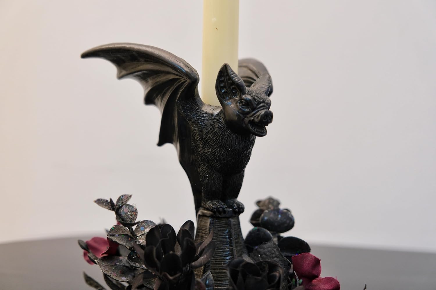 Bat Shaped Halloween Candle Holder, Black Resin Candlestick Holder with Black&Burgundy Artificial Flower, Gothic Halloween Decor for Coffee Table/Dining Table Centerpiece, 6" Height