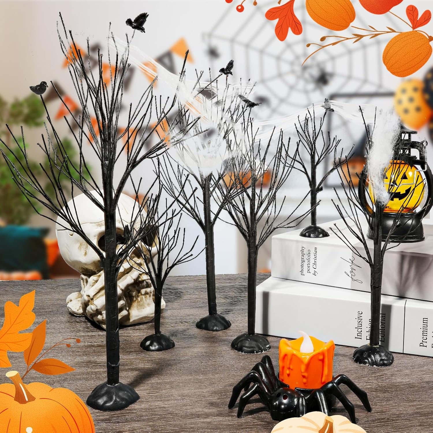 Warmtree 6 Pcs Halloween Village Trees Mini Decor Tree Artificial Tabletop Branch Trees, Halloween Village Accessories with Crows Figurine for Holiday Home Garden Office Festival Decor