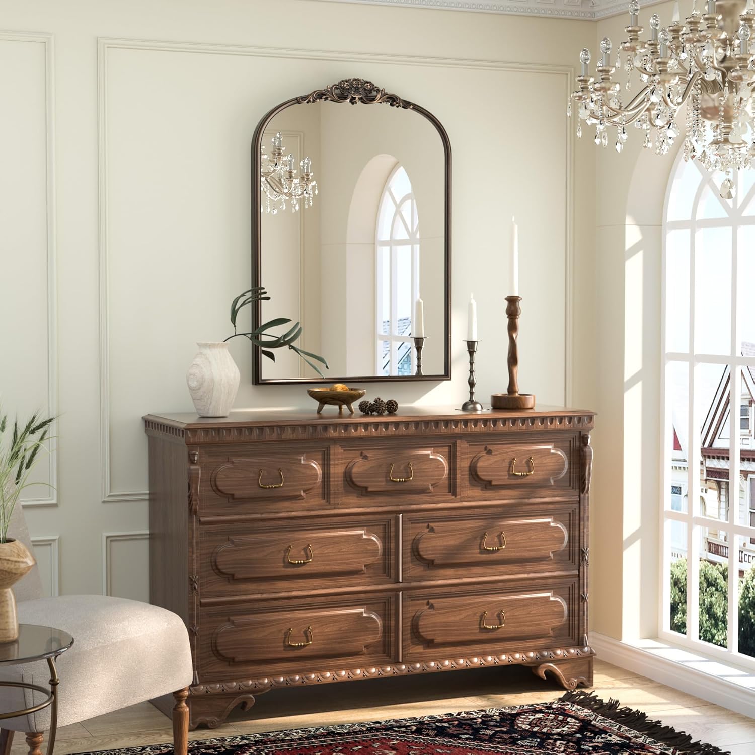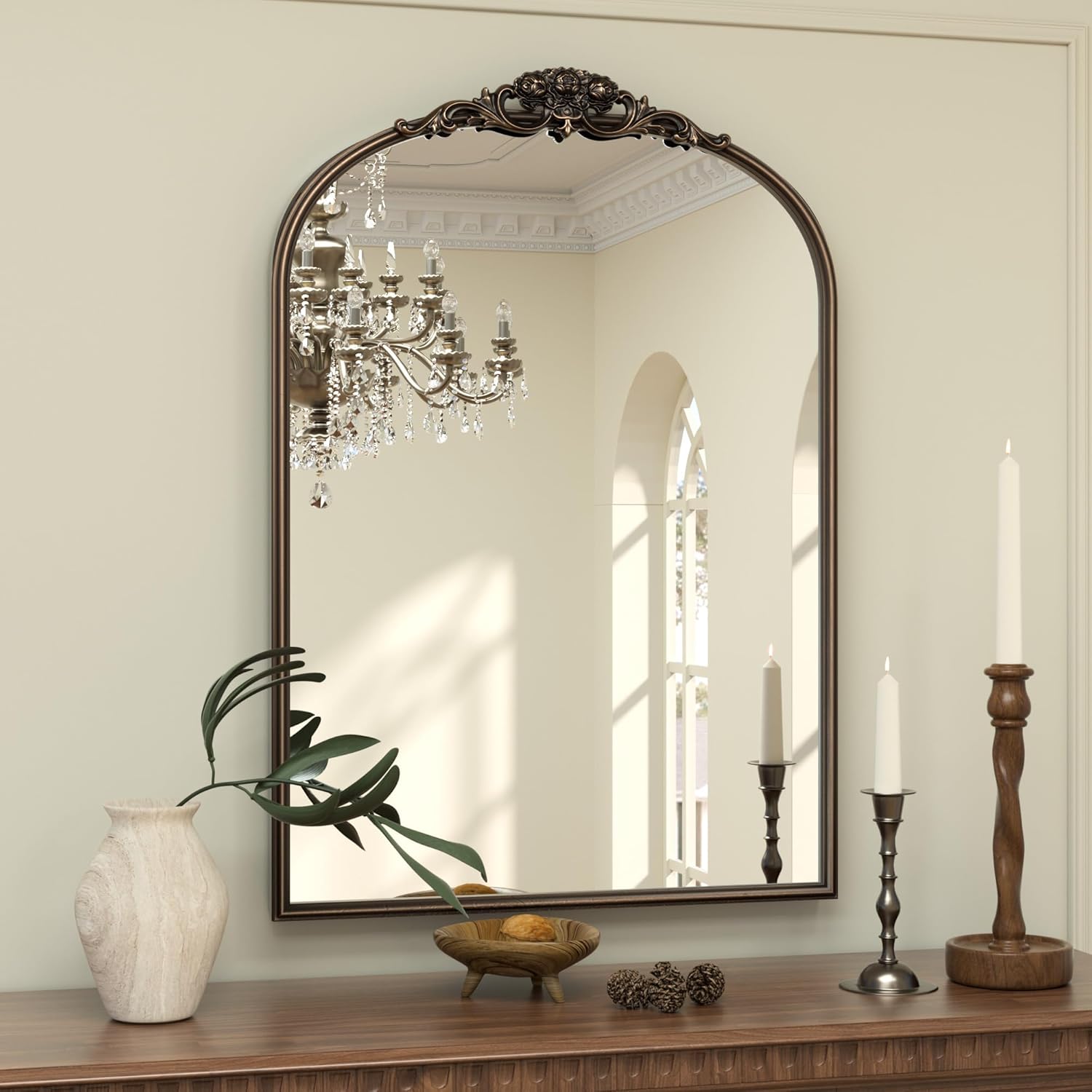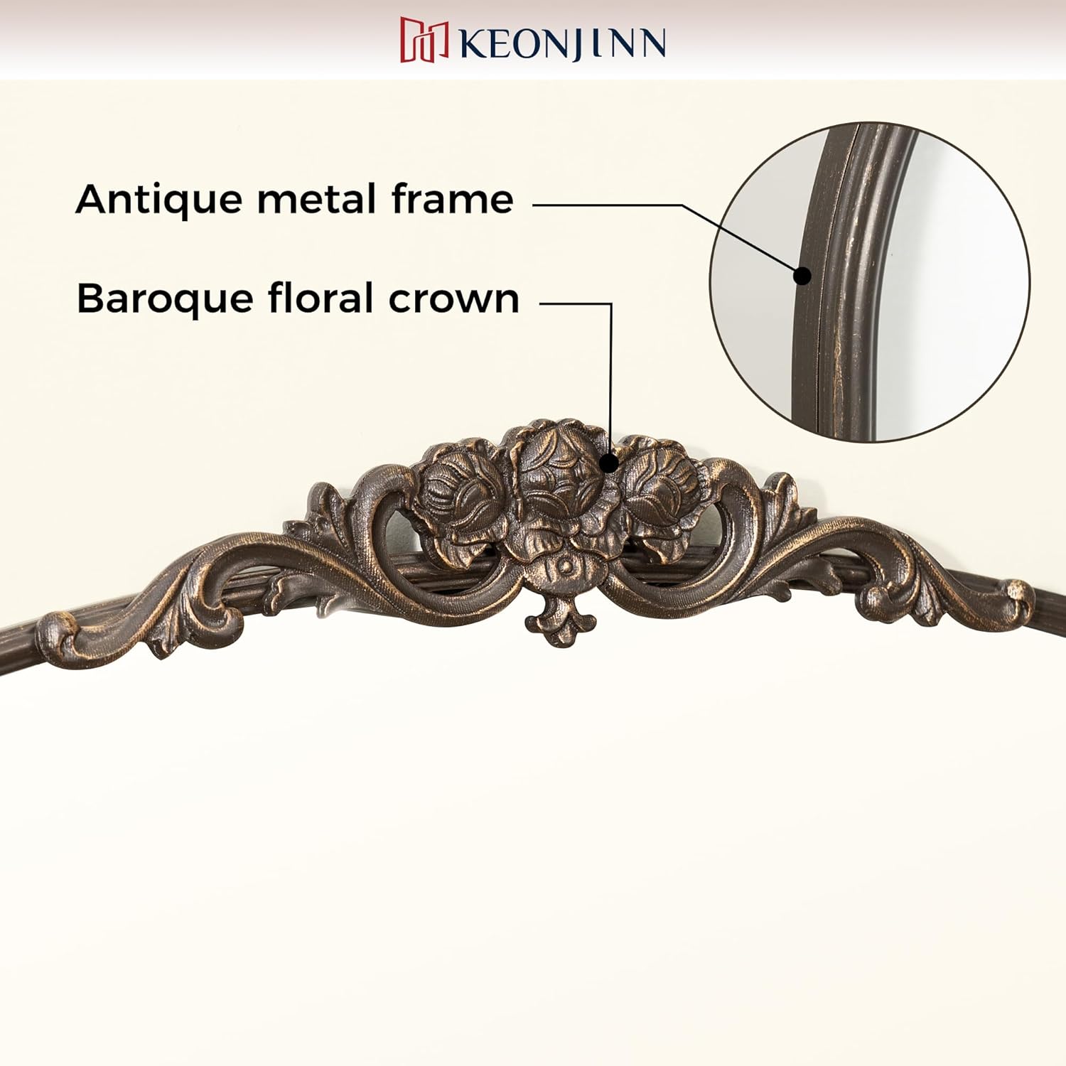 - 【Elevate Your Space with Baroque Grandeur】The Keonjinn Vintage Mirror is a masterpiece of timeless elegance, channeling the lavish artistry of the Baroque era. Its sweeping arched silhouette, adorned with an intricately carved wooden floral crown, transforms walls into canvases of historical opulence. Perfect as a statement centerpiece, this mirror infuses rooms with regal charm and a touch of old-world drama.