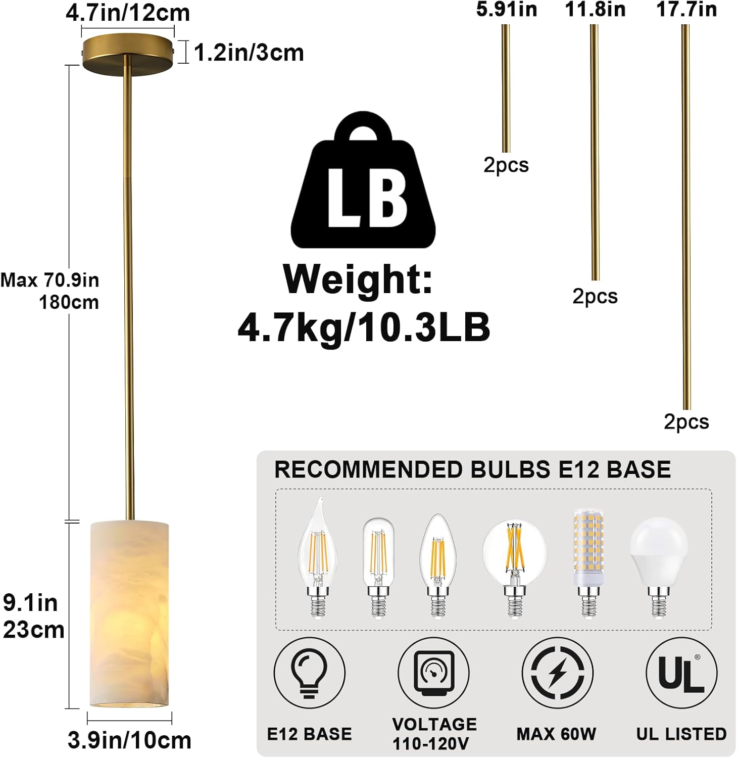 - 【Height Adjustable & Brightness】The alabaster pendant light is H 10‘’ , Φ 4'', Weight: 11.8lb. Installation with 6 connecting rods: 5.91'' 2pcs, 11.8'' 2pcs, 17.7'' 2pcs with a maximum length of 71'' (180cm). You can DIY the chandelier to your preferred height as needed. Compatible with 90% of dimmer switches on the market, freely adjust 10%-100% brightness, allowing you to customize your lighting atmosphere for any mood or occasion. (DIMMER NO INCLUDED).