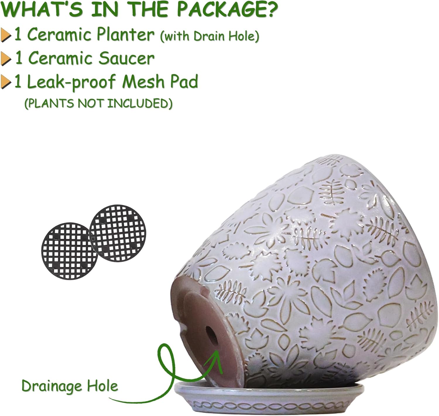 - Size & Package: 10 Inch Pot . Package: contains 1 ceramic flower pots, 1pcs mesh pads and 1pcs saucers(NOT INCLUDE PLANTS)