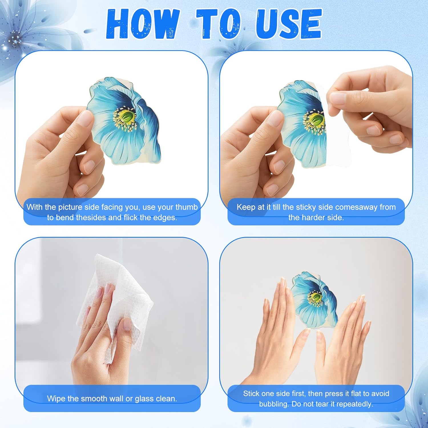 - NOTE:Butterfly wall stickers are suitable for smooth latex painted walls, ceramic tiles, glass, and flat wood/metal surfaces. They are not suitable for rough surfaces (such as diatom mud and cultured stone), flaking surfaces, or damp areas. Avoid applying these stickers to damp surfaces, as they can easily break. If applied to rough surfaces, the wall may flake.