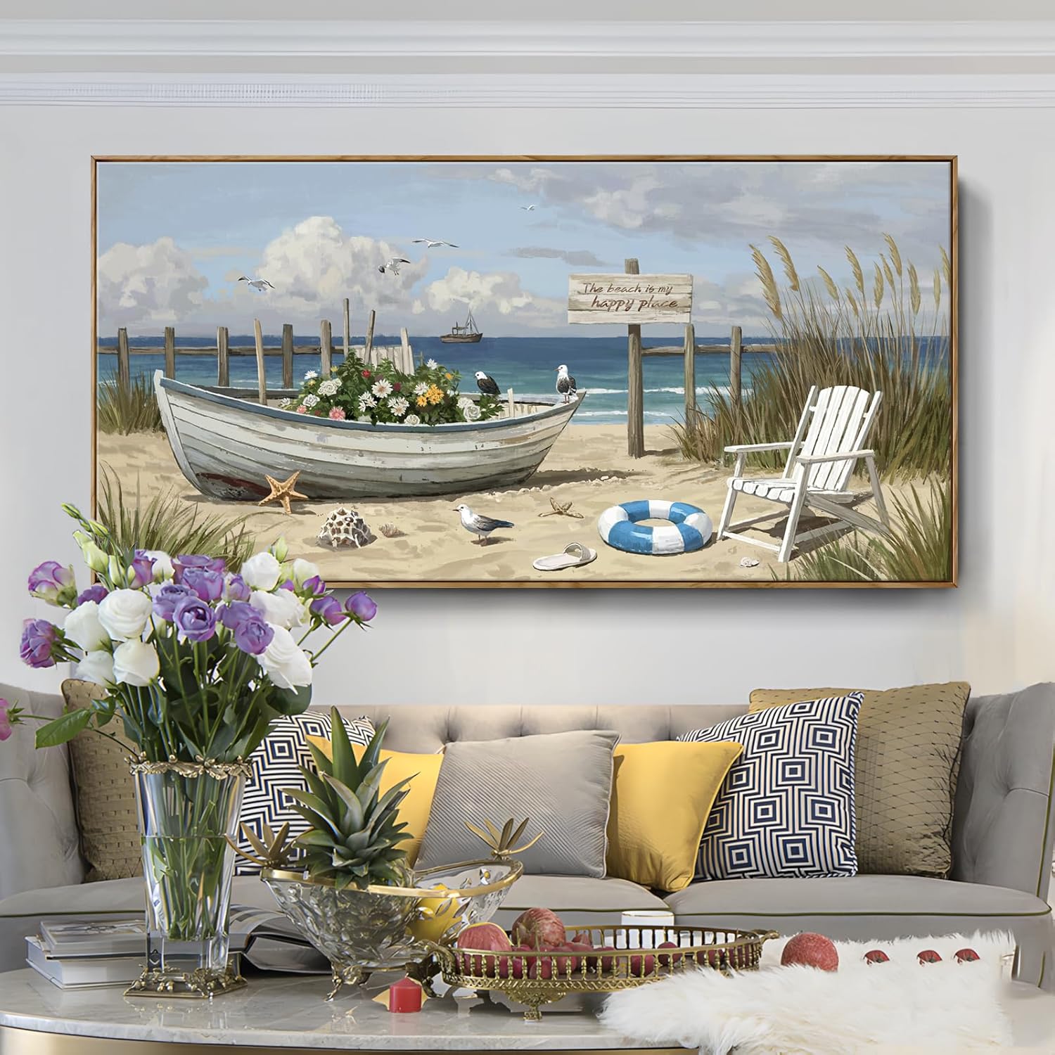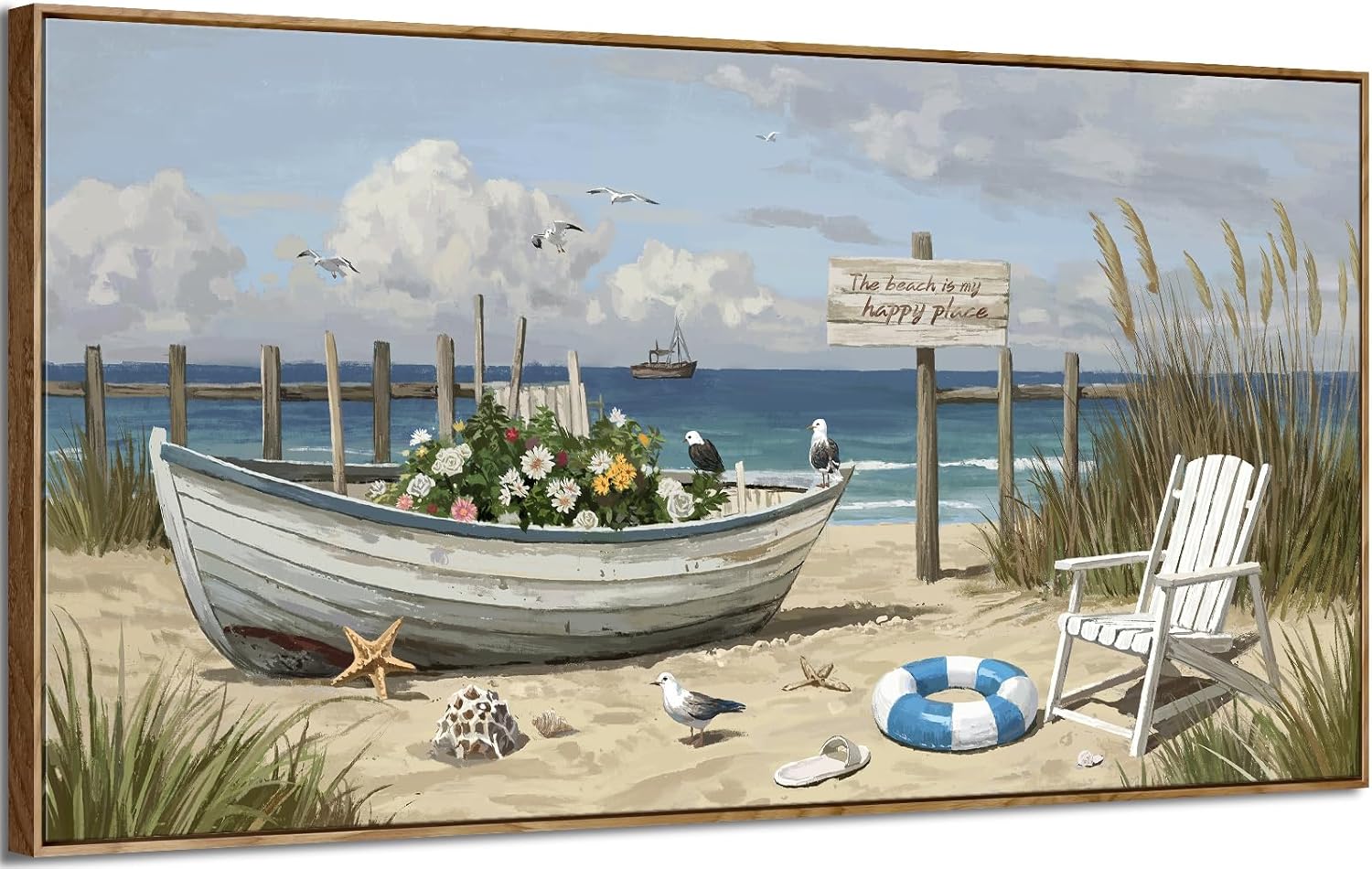 - Coastal Serenity for Your Space: Transform your space with this oversized 58x29 inch framed coastal wall art, capturing the essence of seaside calm. Featuring a charming flower-filled wooden boat resting on sunlit sand, surrounded by seashells, ocean breeze, and flying seabirds, it brings a peaceful nautical touch to any large room—ideal for living rooms, spacious bedrooms, entryways, or beach cottages.