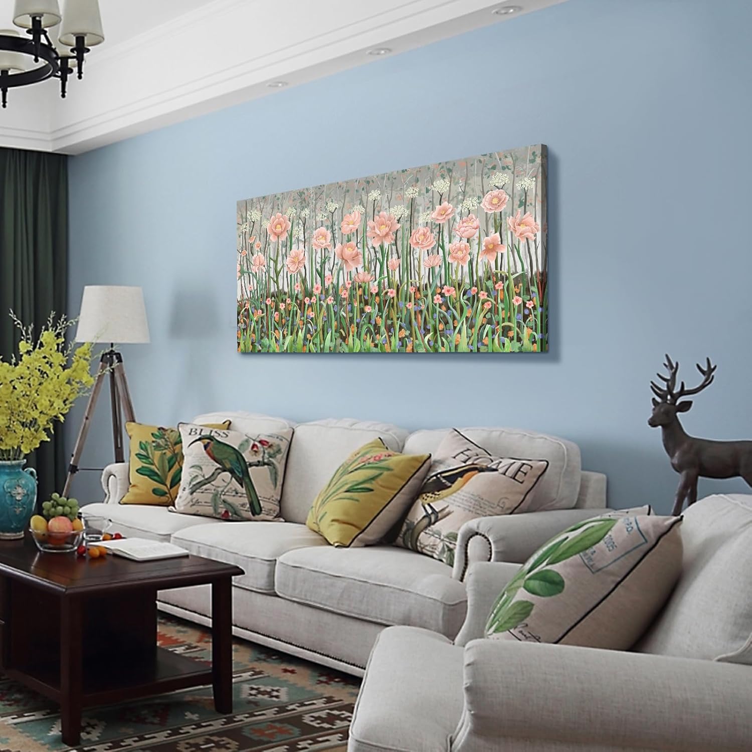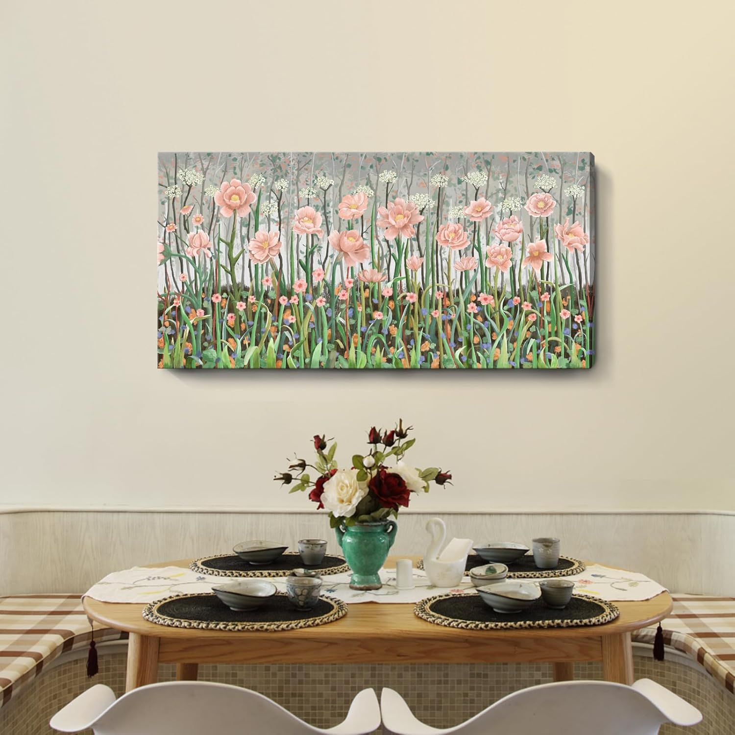 amatop Large Floral Wall Art Modern Abstract Flower Field Canvas Picture Botanical Artwork Rustic Wall Decor for Living Room Bedroom Pink Green Blooming Wildflower Forest Nature Art Print 48x24in