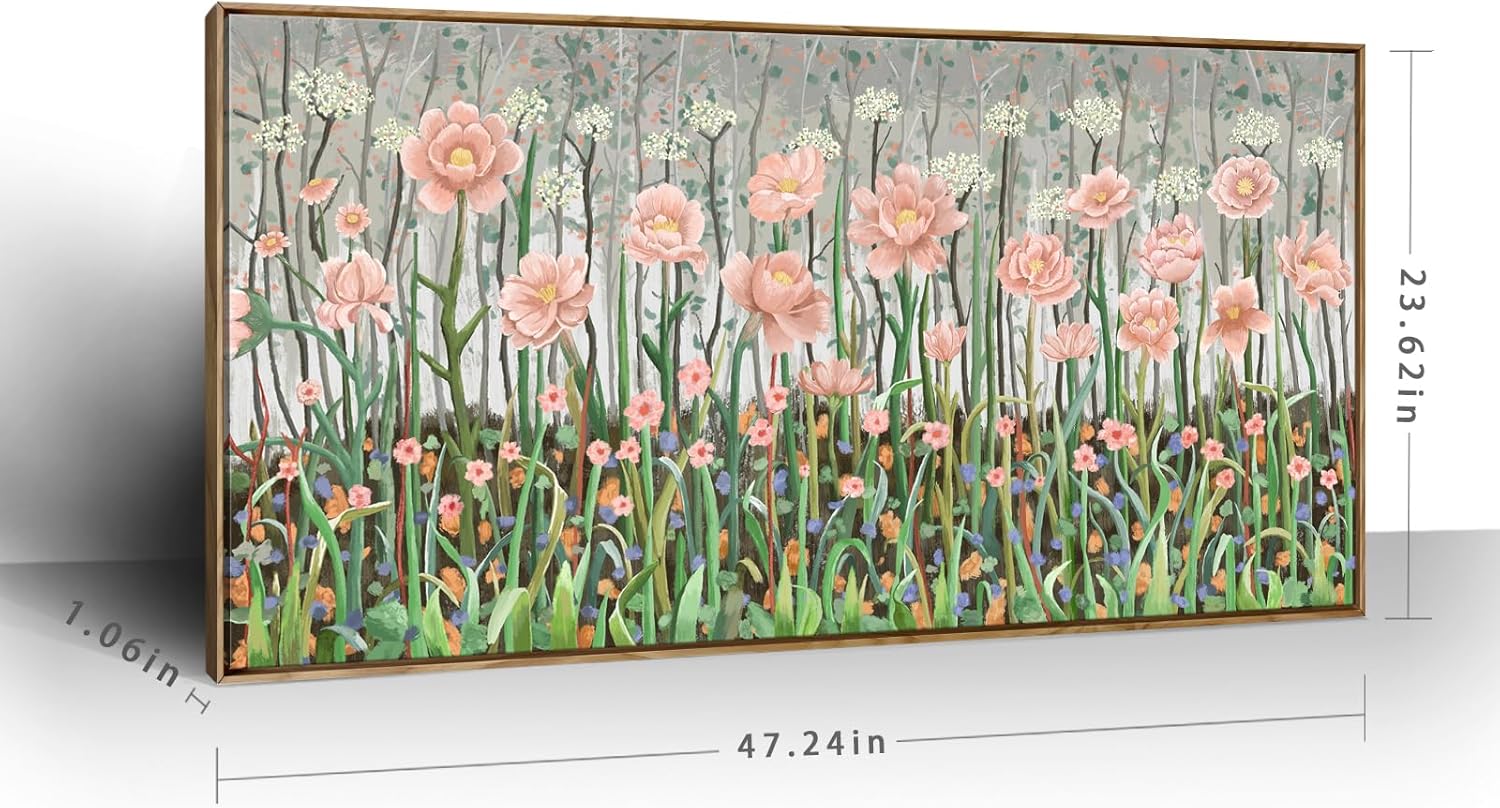 amatop Framed Large Floral Wall Art Modern Botanical Canvas Print Flower Field Wall Decor Abstract Landscape Picture Blooming Flower Forest Pink Green Artwork for Living Room Bedroom Office 48x24 in