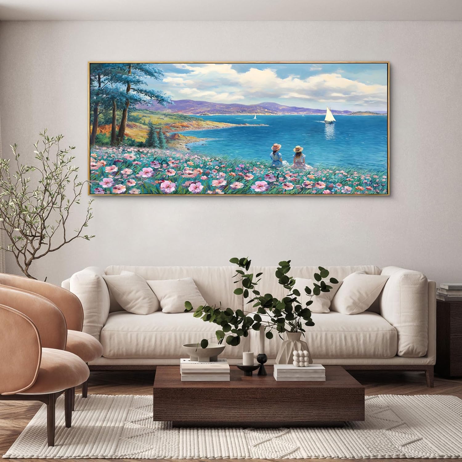 - Large Landscape Wall Art Blue Ocean Pink Flower Sailboat Mountain Tree Wall Decor Orange Frame Artwork for Wall Large Picture for Living Room Bedroom Home Office Wall Decoration Size 29x58