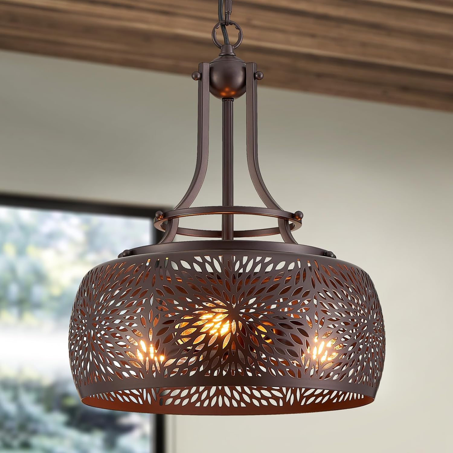 WUZUPS Chandelier Rustic Farmhouse Industrial Round Ceiling Pendant LED Light Fixture with Later-Cut Openwork Drum Shade, H 15.7" x W 13.4", Oil Rubbed Bronze