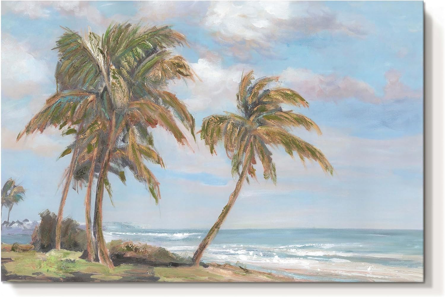 - Coastal palm tree Canvas Wall Art This 36"x24" framed masterpiece features a stunning beach palm tree scene with crashing ocean waves, perfect for creating a serene coastal escape in bathrooms, beach houses, or living rooms. UV-resistant inks prevent fading for years.