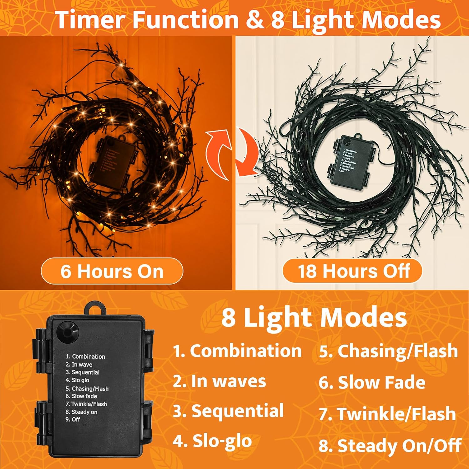 - 🎃【TIMER FUNCTION】This light up halloween decorations lights is powered by 3 AA batteries (not included). When you turn on the timer functions, the timer will be activated and it will come on for 6 hours, then automatically turn off and come back on after 18 hours. It will cycle every day until you turn off the light