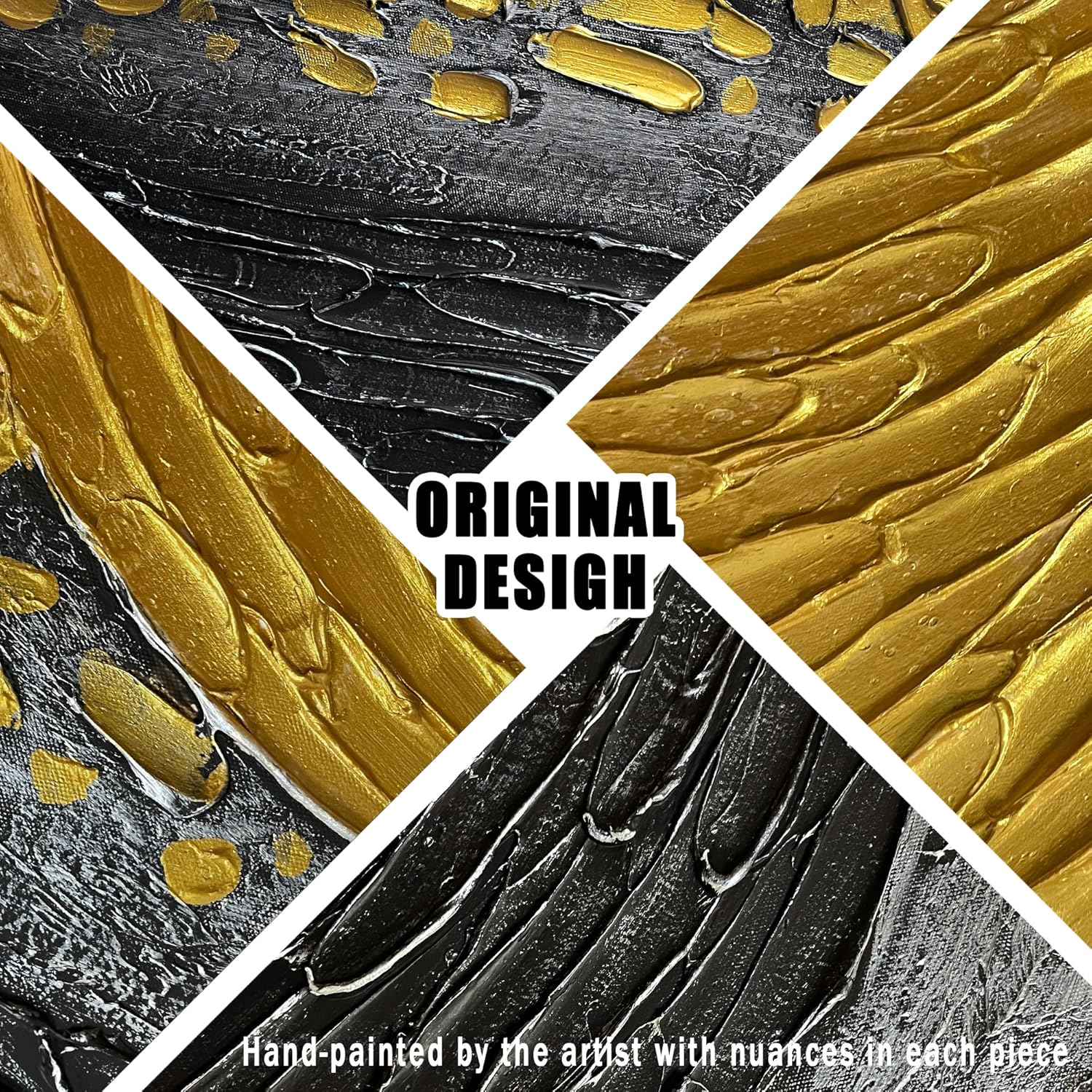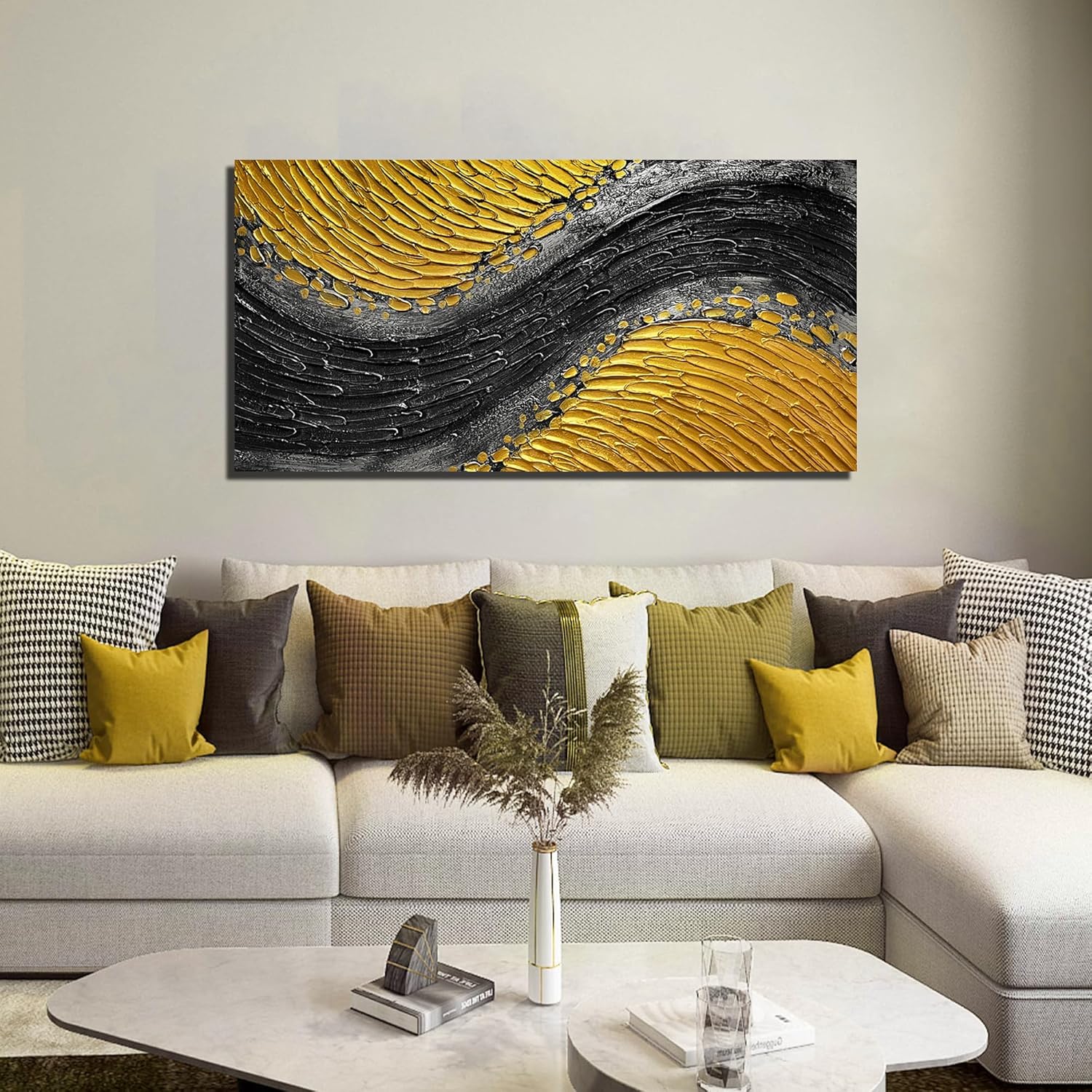- 【Canvas Mural Size】theme "Black And Gold Abstract" The size is 24" x47". Since each painting is hand-painted, the actual painting may differ slightly from the product image. Due to different monitor brands, the actual wall painting color may be slightly different from the product picture.