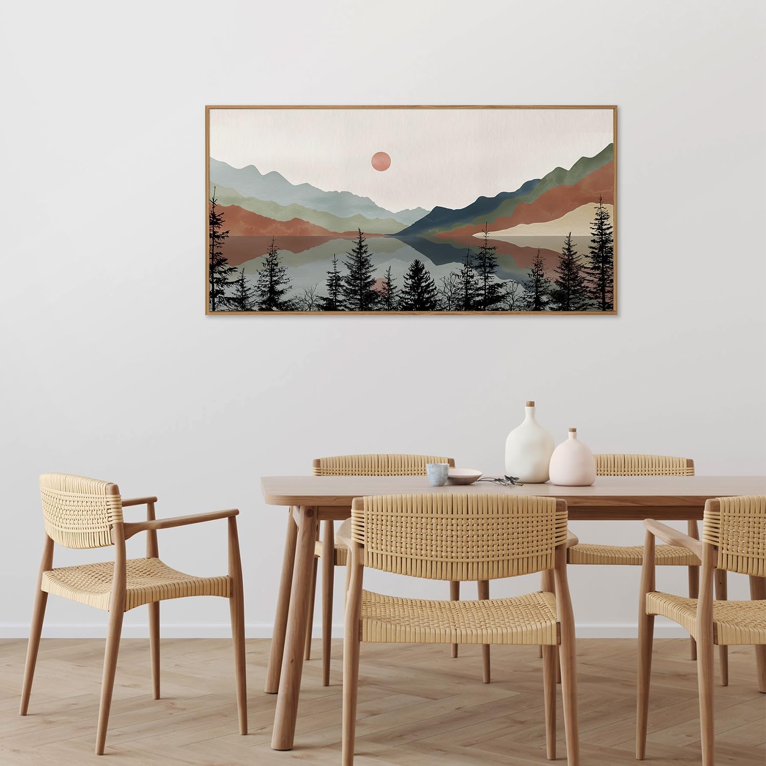 Tinonedraw Boho Mountain Framed Canvas Wall Art Set, Watercolor Nature Landscape Wall Decor, Neutral Modern Sunrise Artwork, Black Pine Trees Forest Art Prints for Living Room Bedroom Office 20"x40"