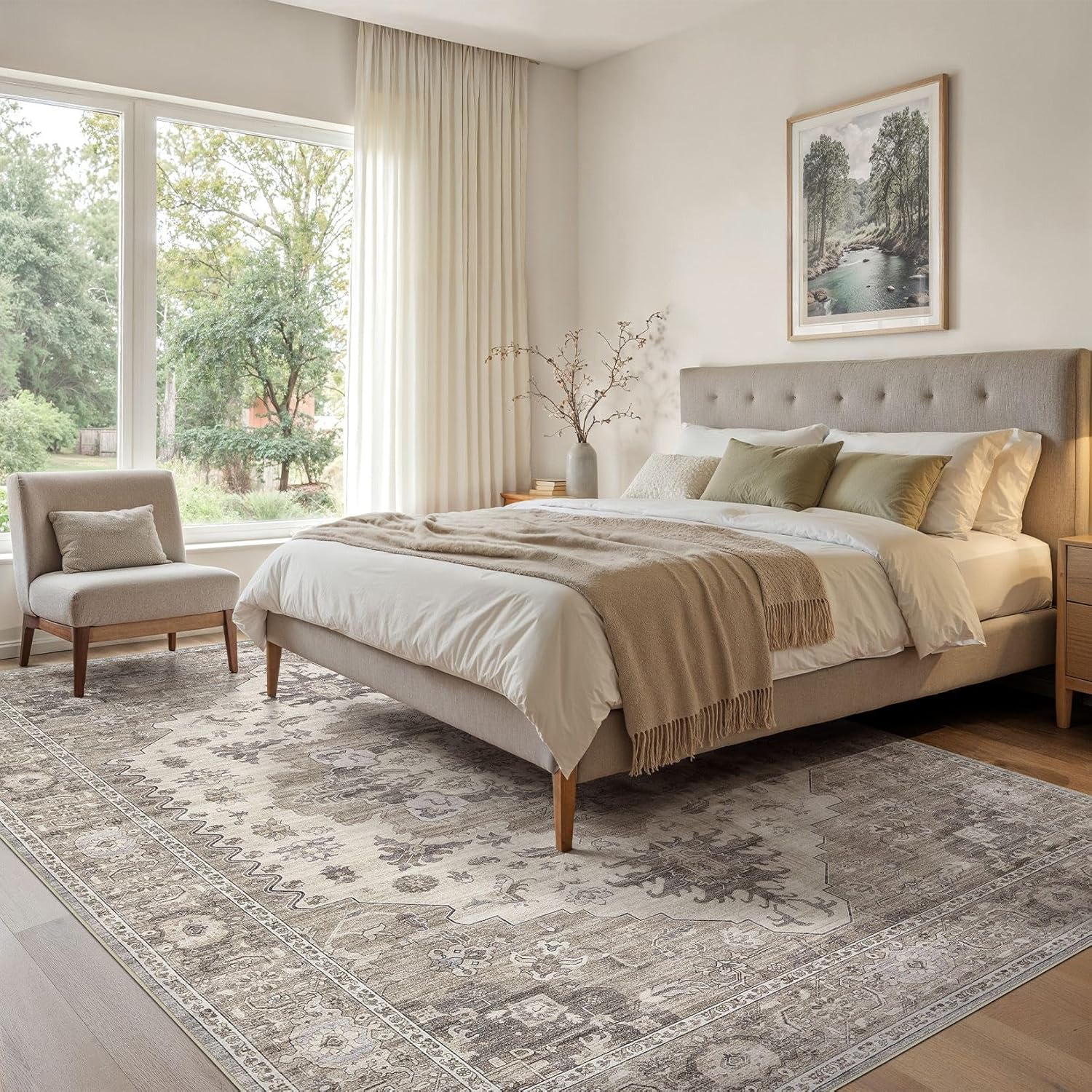 Washable Area Rugs for Living Room - 5x7 Neutral Vintage Distressed Floral Farmhouse Boho Large Soft Floor Rug Indoor Non Slip Carpet for Living Room Bedroom Dining Room Office -Brown/Beige
