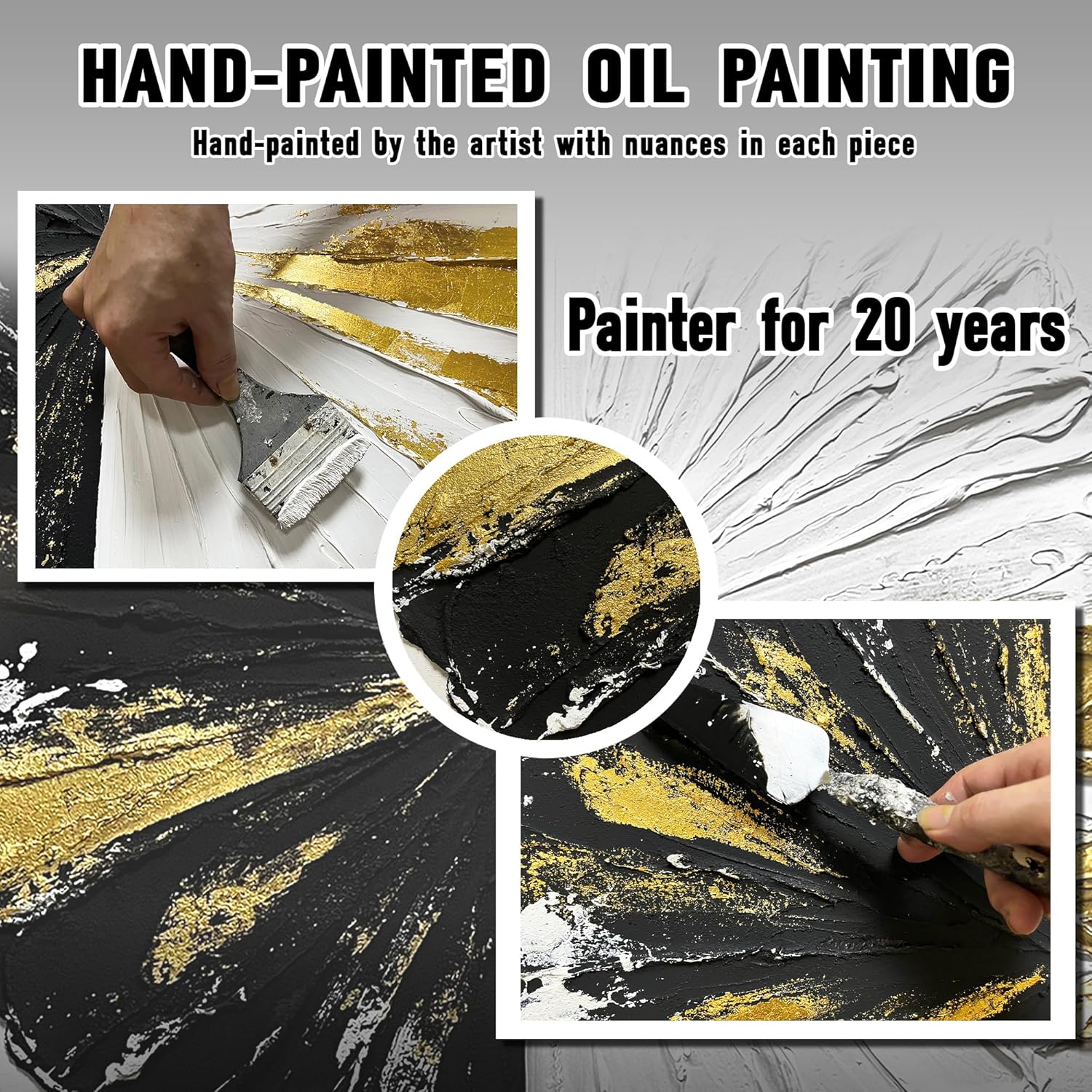 - 【Canvas Mural Size】Black white and gold abstract wall art.The Size is 40" x 20". Since each painting is hand-painted, the actual painting may differ slightly from the product image. Due to different monitor brands, the actual wall painting color may be slightly different from the product picture.