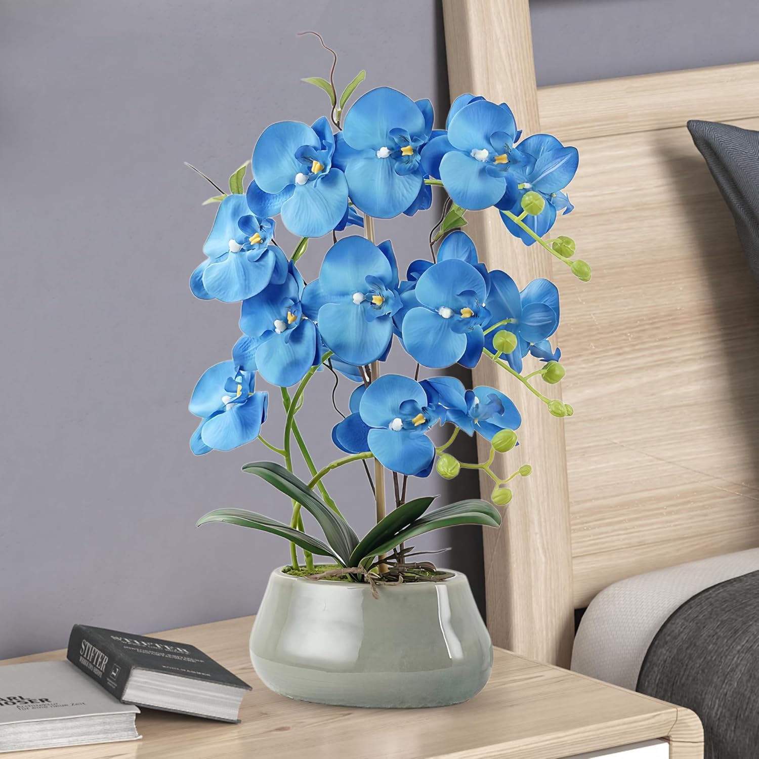 Orchid Artificial Flowers with Gray Vase Large Silk Faux Phalaenopsis Flowers for Dining Room Table Floral Centerpieces Indoor Decoration,Blue