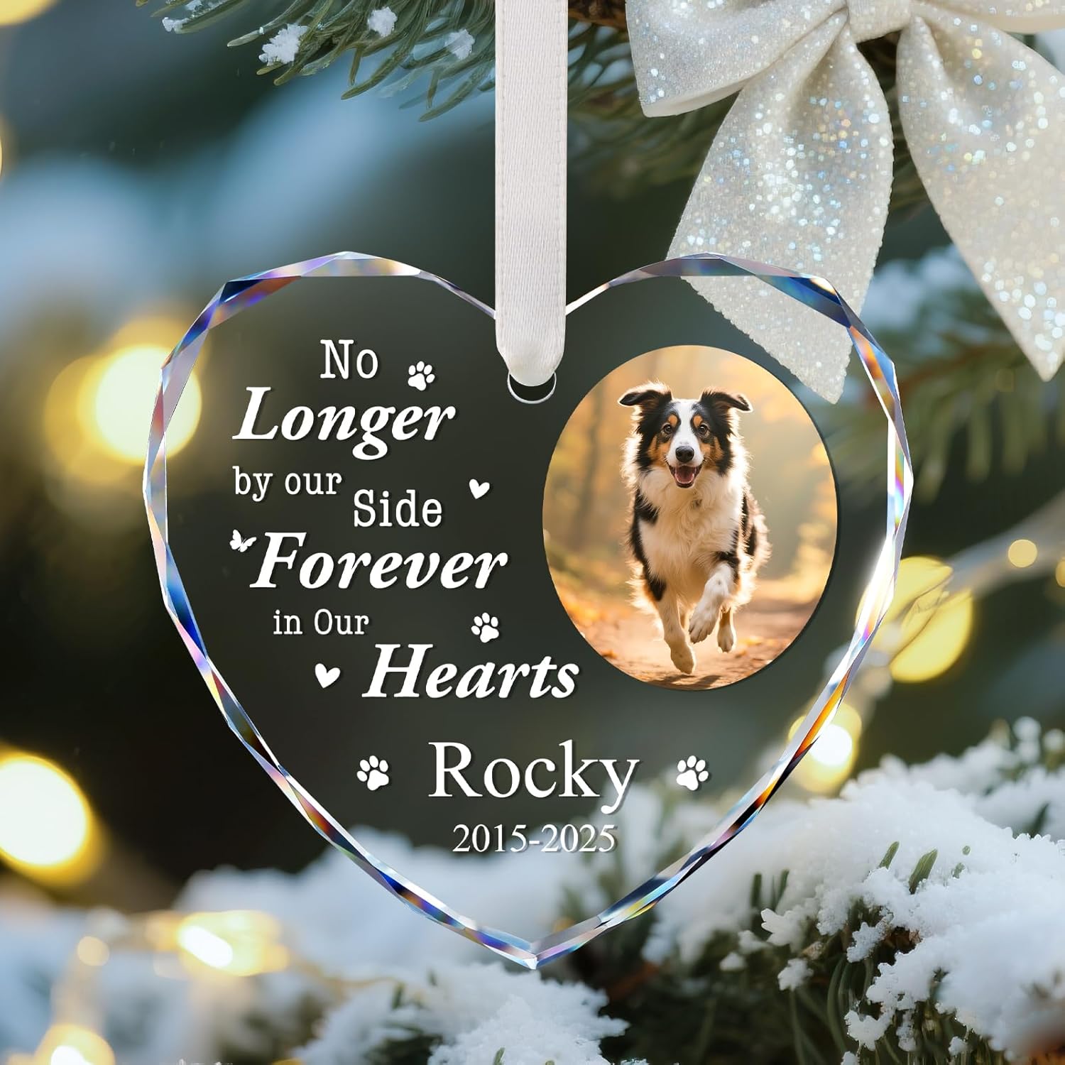 - CUSTOMIZED PET MEMORIAL ORNAMENT: Personalize a tribute to your furry friend with a custom ornament featuring their photo, name, and years. Create a unique keepsake honoring the special moments shared with your beloved pet.