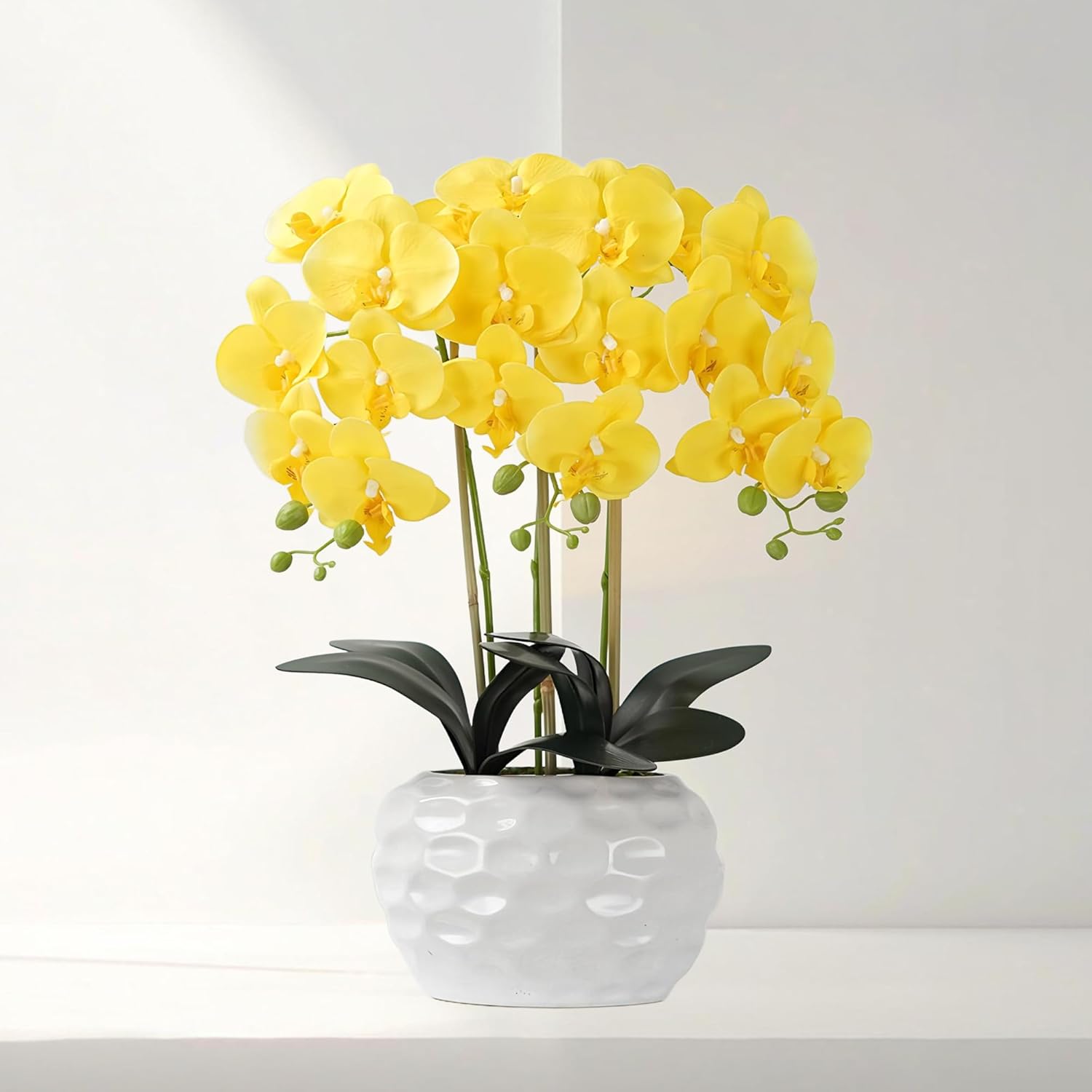 Orchid Artificial Flowers with White Vase Large Silk Faux Phalaenopsis Flowers for Dining Room Table Floral Centerpieces Indoor Decoration,Yellow