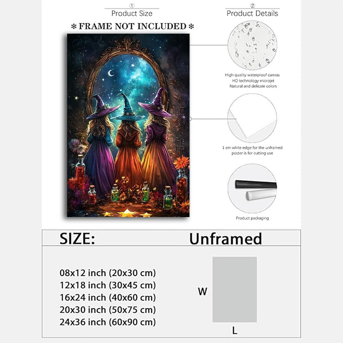 Witch Poster Halloween Fall Wall Art Decor,Three Witches with Magic Potion Mirror Colorful Vintage Print,Dark Academia Spooky Canvas Art Prints for Home Living Room,24"x36" Unframed