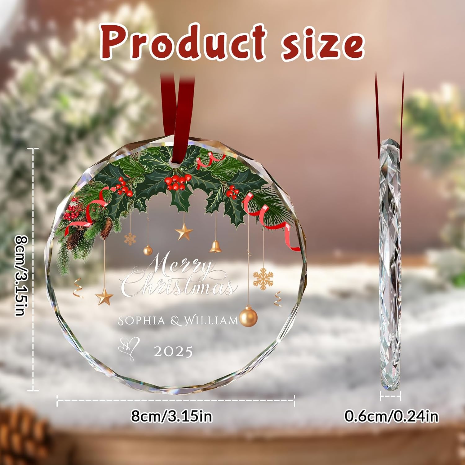 - Choose from a variety of styles: Personalized glass Christmas ornaments come in two shapes, heart-shaped and round. The heart-shaped ornament is 3.15 inches long and 2.95 inches wide, while the round ornament has a diameter of 3.15 inches. We have carefully designed seven different templates for custom Christmas ornament, covering a variety of styles such as Christmas elements, wedding elements, and pet elements. No matter what style you like, you can find a design that suits your taste and easily create your own unique style