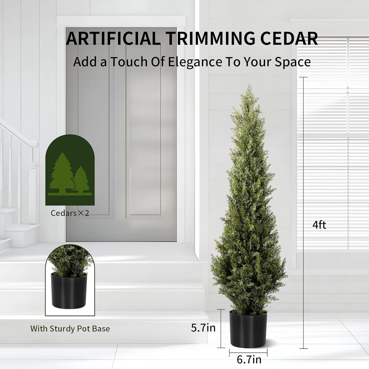 - 【Multi-Size Selection】These artificial topiary cedar trees have 3ft(36in)/4ft(48in)/5ft(60in)sizes, and each fake pine trees with quality black pots. Of course, to go better with the style of your house, you can put them in your other matching pots, and they will sit easily inside the bigger pots.