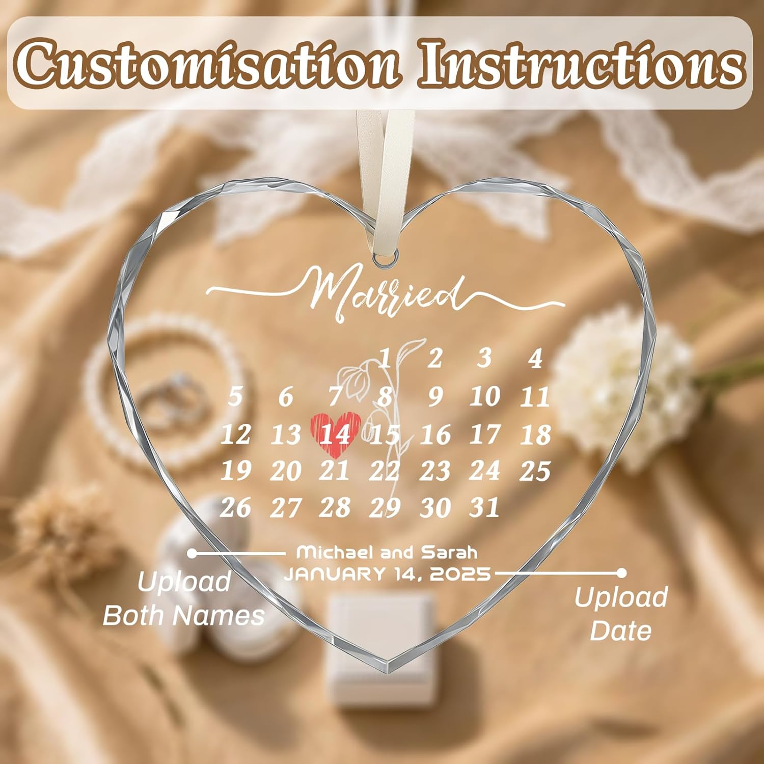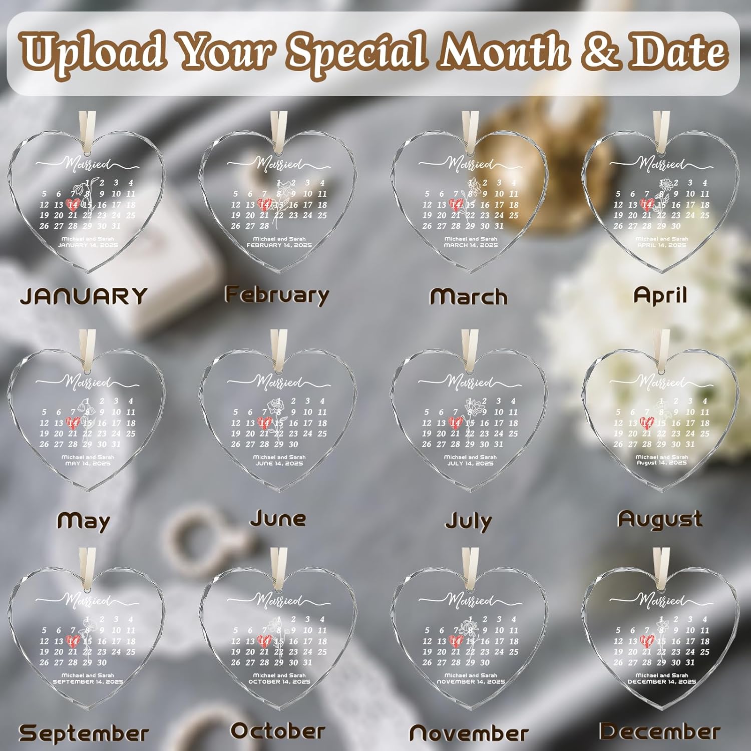 - Custom Wedding Ornament: The personalized wedding ornament feature classic heart and round designs. Choose your preferred pattern style, upload your photo, name, or date to customize a crystal ornament crafted to celebrate newlyweds and eternal love. Each custom glass ornament boasts a brilliant, lustrous surface with a premium feel. It serves as the perfect vessel to convey your heartfelt blessings
