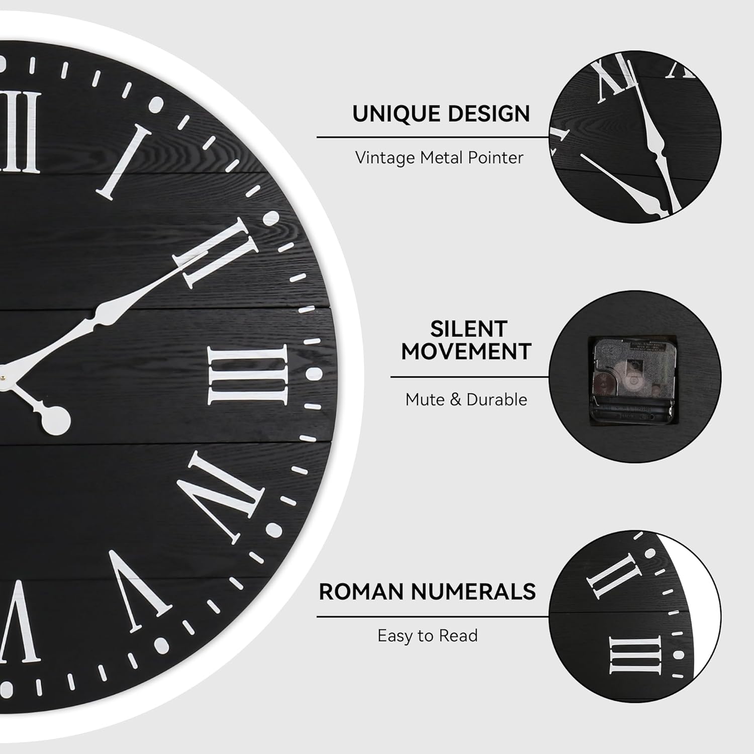 Large Wall Clock with Roman Numeral, 35” Shiplap Wall Clock Farmhouse Nearly Non-Ticking, Round Clock for Living Room Decor, Office, Bedroom, Entrance, Black