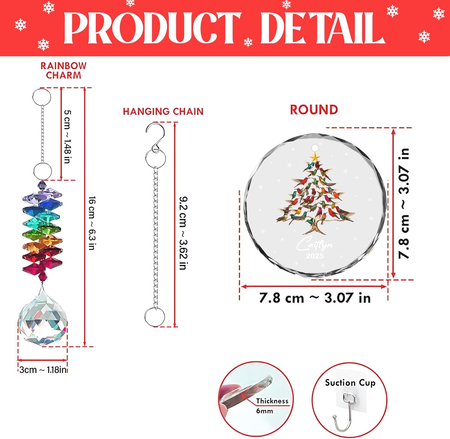 - Crafted from premium-quality glass, this ornament is designed with clear, smooth edges and precise engraving that highlights the intricate design. The rainbow suncatcher adds a beautiful, reflective touch, catching the light and enhancing the ornament’s vibrant colors.